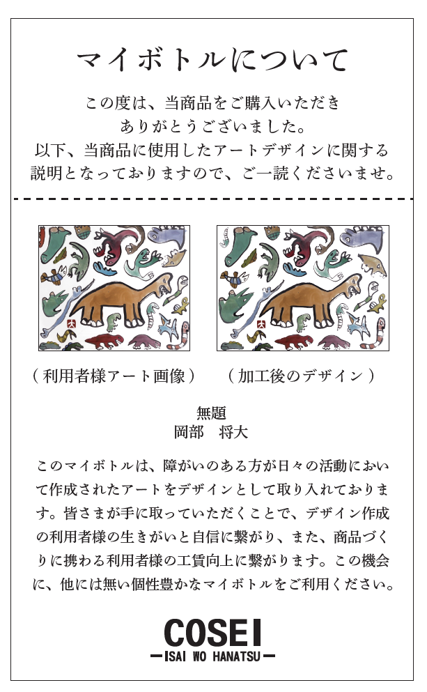 このマイボトルは、障がいのある方が日々の活動において作成されたアートをデザインとして取り入れております。皆さまが手に取っていただくことで、デザイン作成の利用者様の生きがいと自信に繋がり、また、商品づくりに携わる利用者様の工賃向上に繋がります。この機会に、他には無い個性豊かなマイボトルをご利用ください。