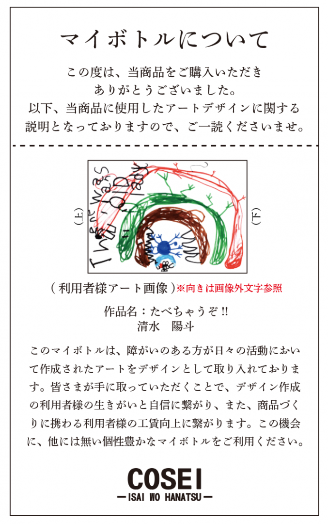 このマイボトルは、障がいのある方が日々の活動において作成されたアートをデザインとして取り入れております。皆さまが手に取っていただくことで、デザイン作成の利用者様の生きがいと自信に繋がり、また、商品づくりに携わる利用者様の工賃向上に繋がります。この機会に、他には無い個性豊かなマイボトルをご利用ください。