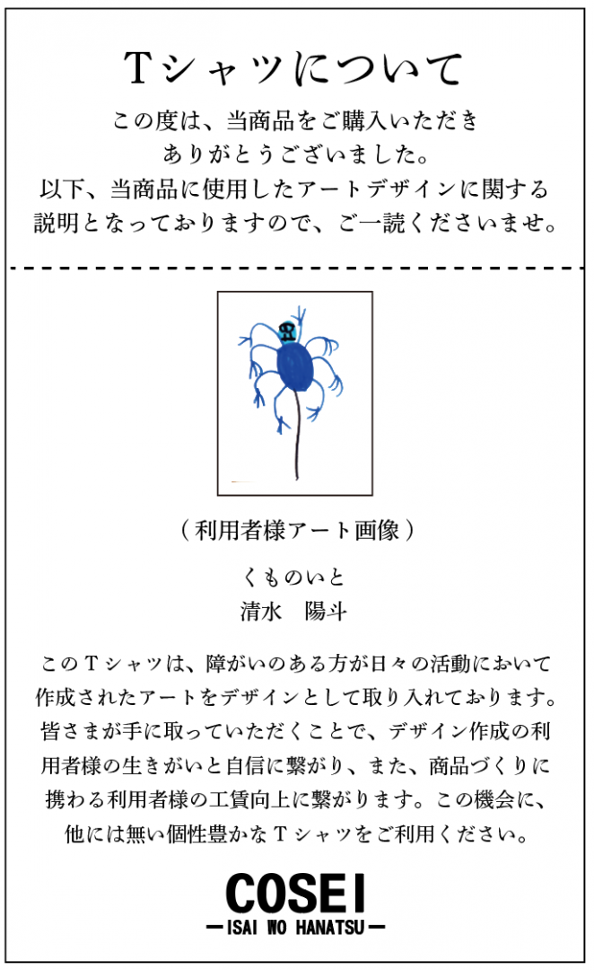 このTシャツは、障がいのある方が日々の活動において作成されたアートをデザインとして取り入れております。皆さまが手に取っていただくことで、デザイン作成の利用者様の生きがいと自信に繋がり、また、商品づくりに携わる利用者様の工賃向上に繋がります。この機会に、他には無い個性豊かなTシャツをご利用ください。