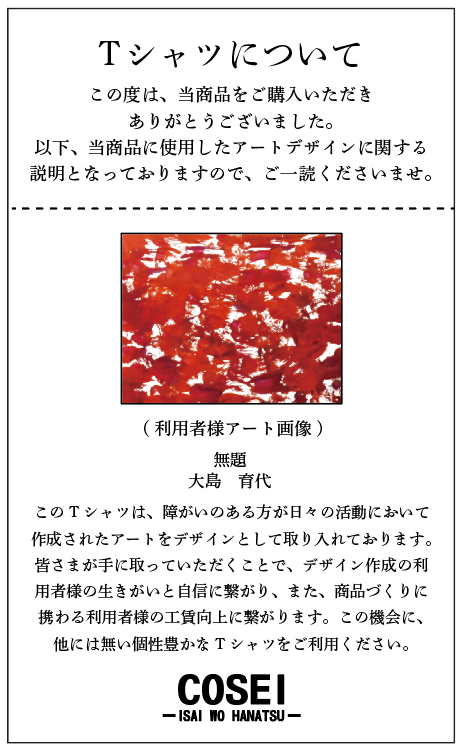 ¤³¤ÎT¥·¥ã¥Ä¤Ï¡¢¾ã¤¬¤¤¤Î¤¢¤ëÊý¤¬Æü¡¹¤Î³èư¤Ë¤ª¤¤¤ÆºîÀ®¤µ¤ì¤¿¥¢¡¼¥È¤ò¥Ç¥¶¥¤¥ó¤È¤·¤Æ¼è¤êÆþ¤ì¤Æ¤ª¤ê¤Þ¤¹¡£³§¤µ¤Þ¤¬¼ê¤Ë¼è¤Ã¤Æ¤¤¤¿¤À¤¯¤³¤È¤Ç¡¢¥Ç¥¶¥¤¥óºîÀ®¤ÎÍøÍѼÔÍͤÎÀ¸¤¤¬¤¤¤È¼«¿®¤Ë·Ò¤¬¤ê¡¢¤Þ¤¿¡¢¾¦ÉʤŤ¯¤ê¤Ë·È¤ï¤ëÍøÍѼÔÍͤι©Ä¸þ¾å¤Ë·Ò¤¬¤ê¤Þ¤¹¡£¤³¤Îµ¡²ñ¤Ë¡¢Â¾¤Ë¤Ï̵¤¤¸ÄÀˤ«¤ÊT¥·¥ã¥Ä¤ò¤´ÍøÍѤ¯¤À¤µ¤¤¡£