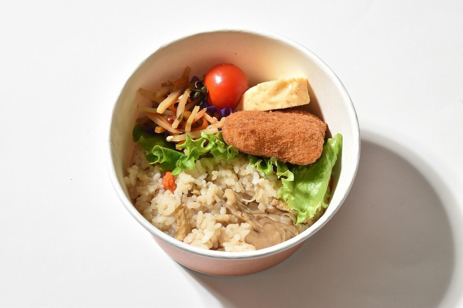 ごはん(ハナエチゼン)、まいたけ、うすあげ、にんじん、栗コロッケ、卵、大根、がんもどき、干しシイタケ、リーフレタス、絹さや、ミニトマト、しょうゆ、酒みりん、砂糖、本だし、サラダ油(一部に卵、小麦を含む)